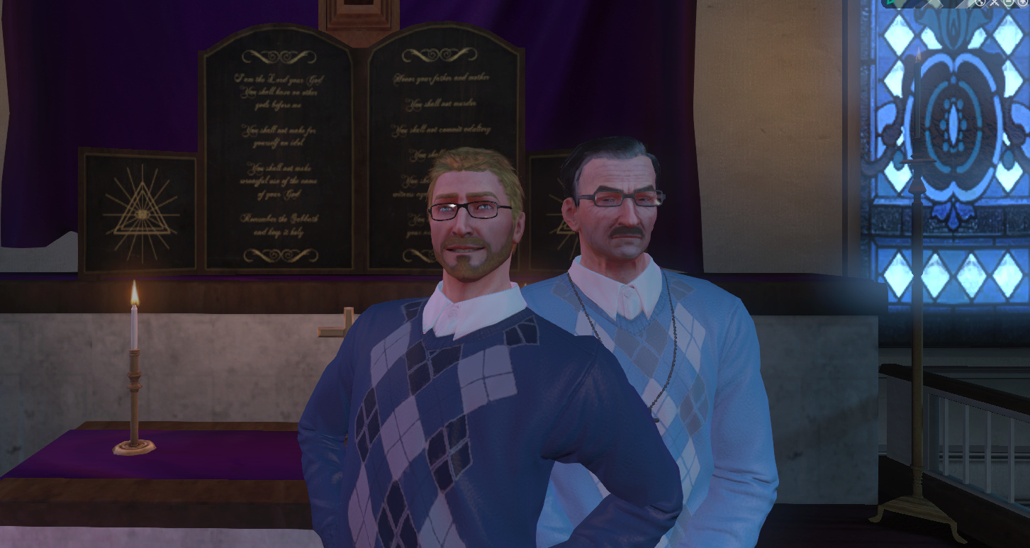 I laughed out loud for real the first time I saw that one, it would have been my pick for 1st place. Matching sweaters with that NPC in the church works so well, it's awesome.
