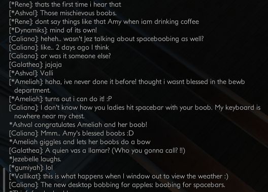 Ashval wrote:Didaskalos wrote:[#Gridstream] [*Vallikat]: oh Cali..... Ok Boinky...great guy.. love him...but ...he's a tad on the crazy side. Anyway he used to constantly request that song from Ashy