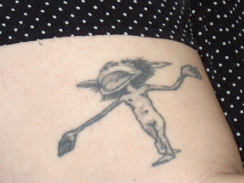 I dont have a picture of the stars on the backs of my hands yet. You'll probably have to see them at D*con. I do, however have a pic of my little Imp. My very first tat.