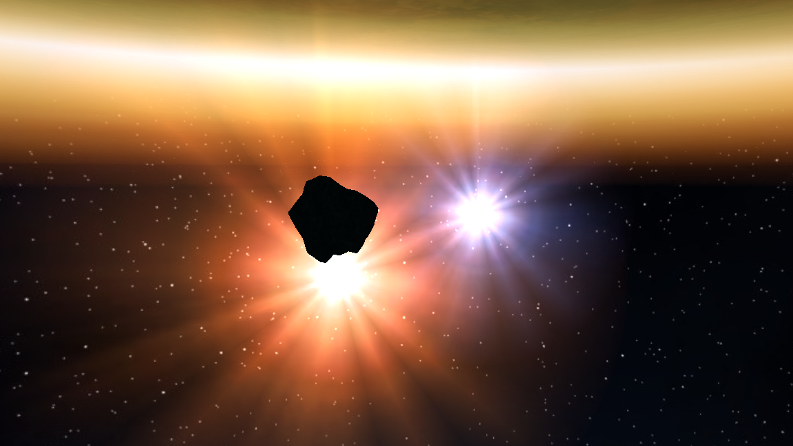 Rubi-Ka dwarfing in the top, with Rubi-Ka's twin suns, and one of a few huge and lazy asteroids strolling past the station.