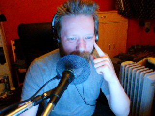 Me, my chair (awsome, leather stressless), my two CRT monitors radiating on my face, my ADD webcam (I may explain this later some day), my mic floor stand, my uber mic, and uber headphones and my uber metal mesh breath shield.