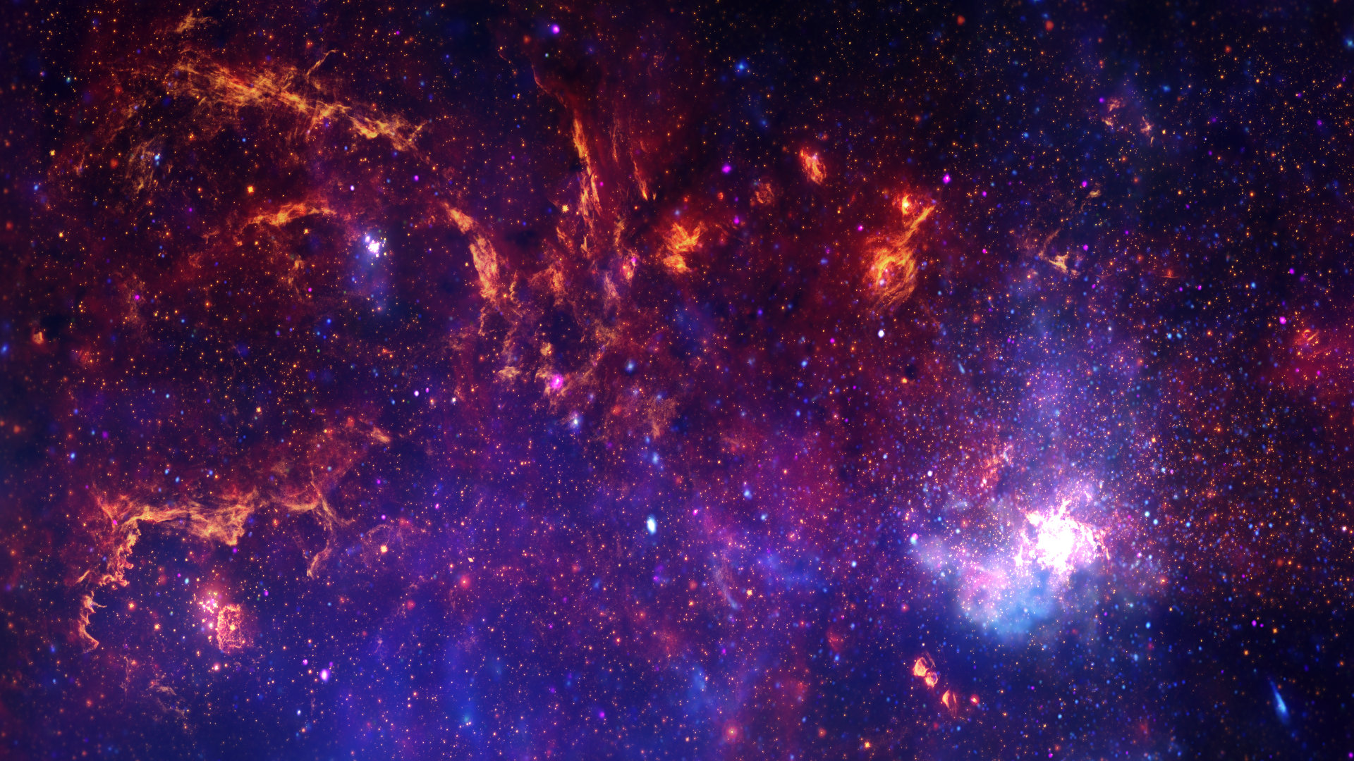 The Milky Way Galaxy, bustling hub of our galaxy that combines a near-infrared view from the Hubble Space Telescope, an infrared view from the Spitzer Space Telescope, and an X-ray view from the Chandra X-ray Observatory into one multiwavelength picture.