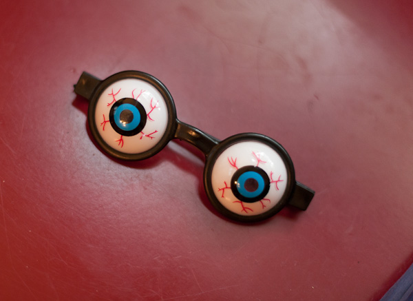 * googly eyes glasses - just big sunglasses with big plastic bloodshot eyeballs, not necessarily on springs (AO+TSW)