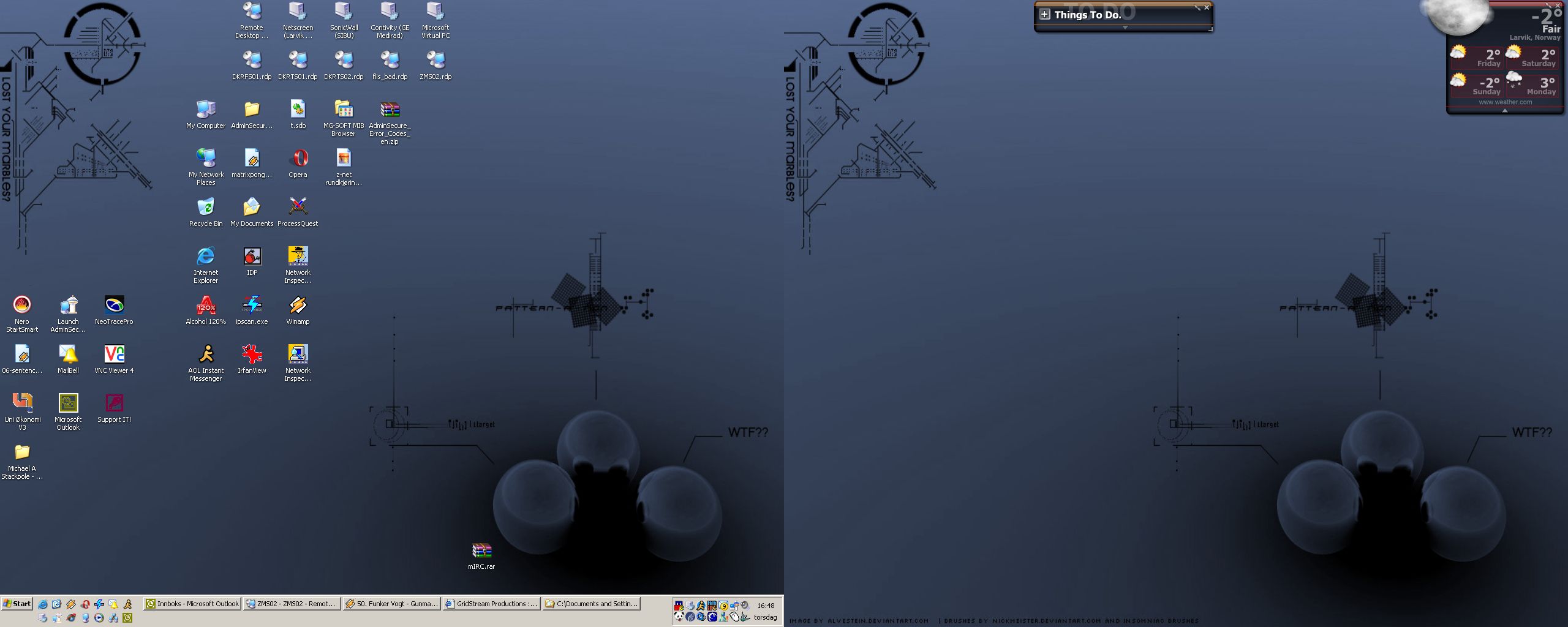 Here's my Desktop at work. Looks a bit weird since I'm running a Dual-screen here at work....