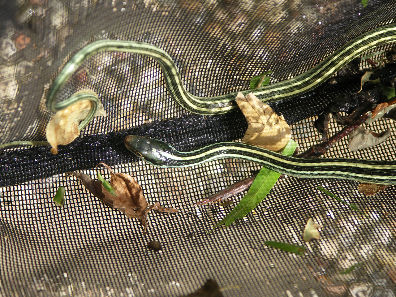 He is one of the increasingly rare Thamnophis species, also known as a Ribbon Snake or Garter snake. Throughout the US, many folks refer to them also as 'grass snakes' although generally that name is reserved for Natrix sp. which have only small lines near the head, and no lateral lines down the body.