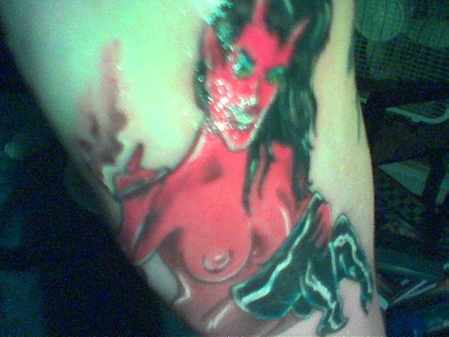 ok heres a crappy pic of my newest ink, just one hour old :P. ill get some better shots later, and i know the proportions look off, but thats just the angle i had to hold the camera at